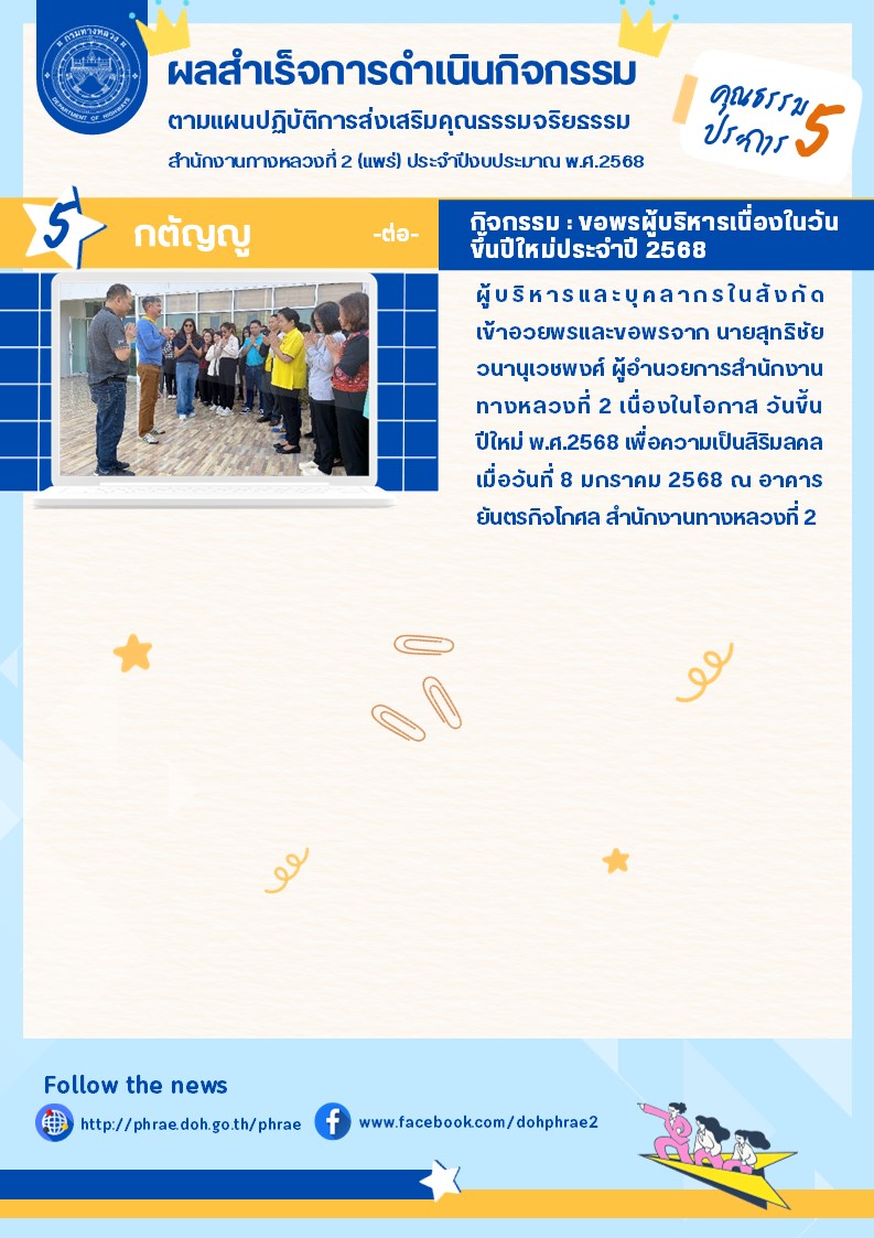 ผลสำเร็จการดำเนินกิจกรรม ตามแผนปฎิบัติการส่งเสริมคุณธรรมจริยธรรม สำนักงานทางหลวงที่ 2 (แพร่) ประจำปีงบประมาณ พ.ศ.2568