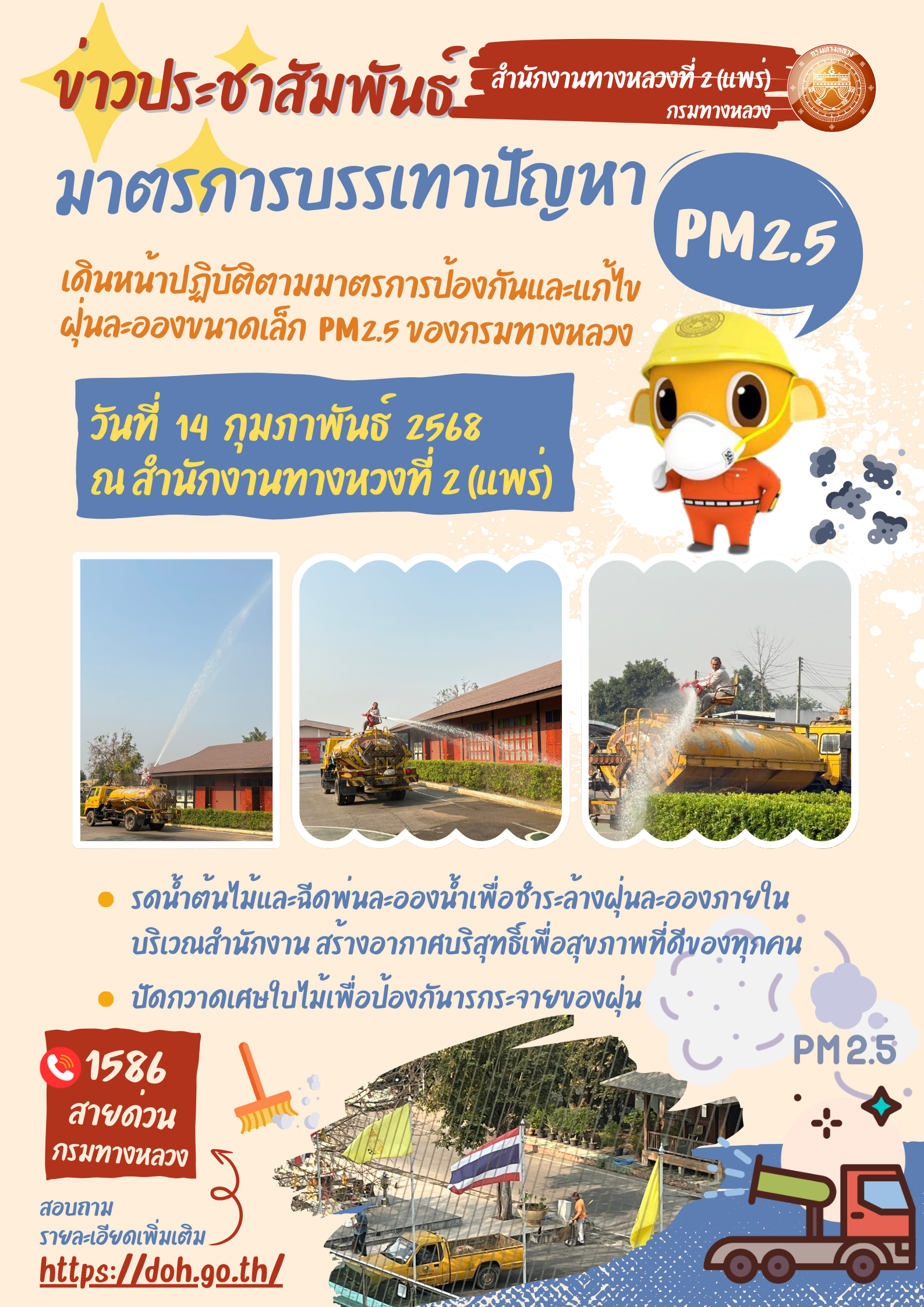 สำนักงานทางหลวงที่ 2 เดินหน้าปฏิบัติตามมาตรการป้องกันและแก้ไขฝุ่นละอองขนาดเล็ก PM 2.5 ของกรมทางหลวง