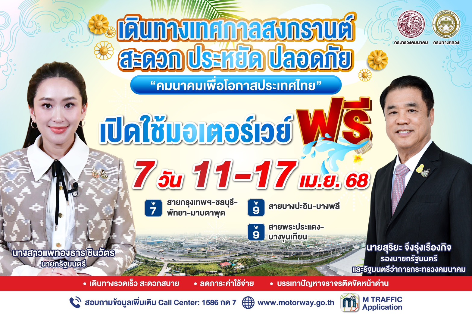 ฟรี 7 วัน! กรมทางหลวง เปิดฟรีมอเตอร์เวย์ระหว่างวันที่ 11 – 17 เม.ย. 68 เพื่ออำนวยความสะดวกในการเดินทางแก่ประชาชนช่วงเทศกาลสงกรานต์ 2568