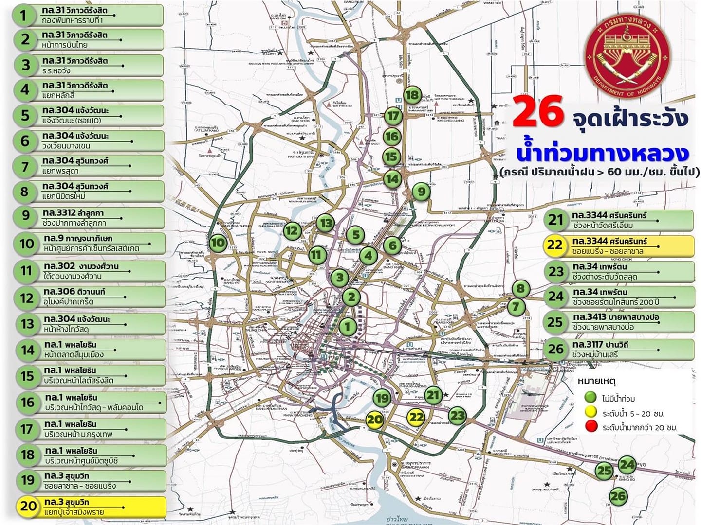 กรมทางหลวงขานรับข้อสั่งการ รมว.คมนาคม เตรียมรับมืออุทกภัยช่วงฤดูฝนทั่วทุกพื้นที่ พร้อมเผย 26 จุดเฝ้าระวังเส้นทางโครงข่ายทางหลวงกรุงเทพและปริมณฑลอย่างต่อเนื่องฤดูฝน เร่งช่วยเหลือดูแลอำนวยความสะดวกปลอดภัยให้กับประชาชนทันที