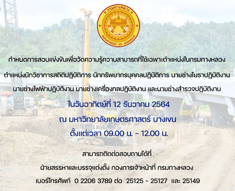 กำหนดการสอบแข่งขันเพื่อวัดความรู้ความสามารถที่ใช้เฉพาะตำแหน่งในกรมทางหลวง ตำแหน่งนักวิชาการสถิติปฏิบัติการ นักทรัพยากรบุคคลปฏิบัติการ นายช่างโยธาปฏิบัติงาน นายช่างไฟฟ้าปฏิบัติงาน นายช่างเครื่องกลปฏิบัติงาน และนายช่างสำรวจปฏิบัติงาน ในวันอาทิตย์ที่ 12 ธันวาคม 2564 ณ มหาวิทยาลัยเกษตรศาสตร์ บางเขน ตั้งแต่เวลา 09.00 น. – 12.00 น.