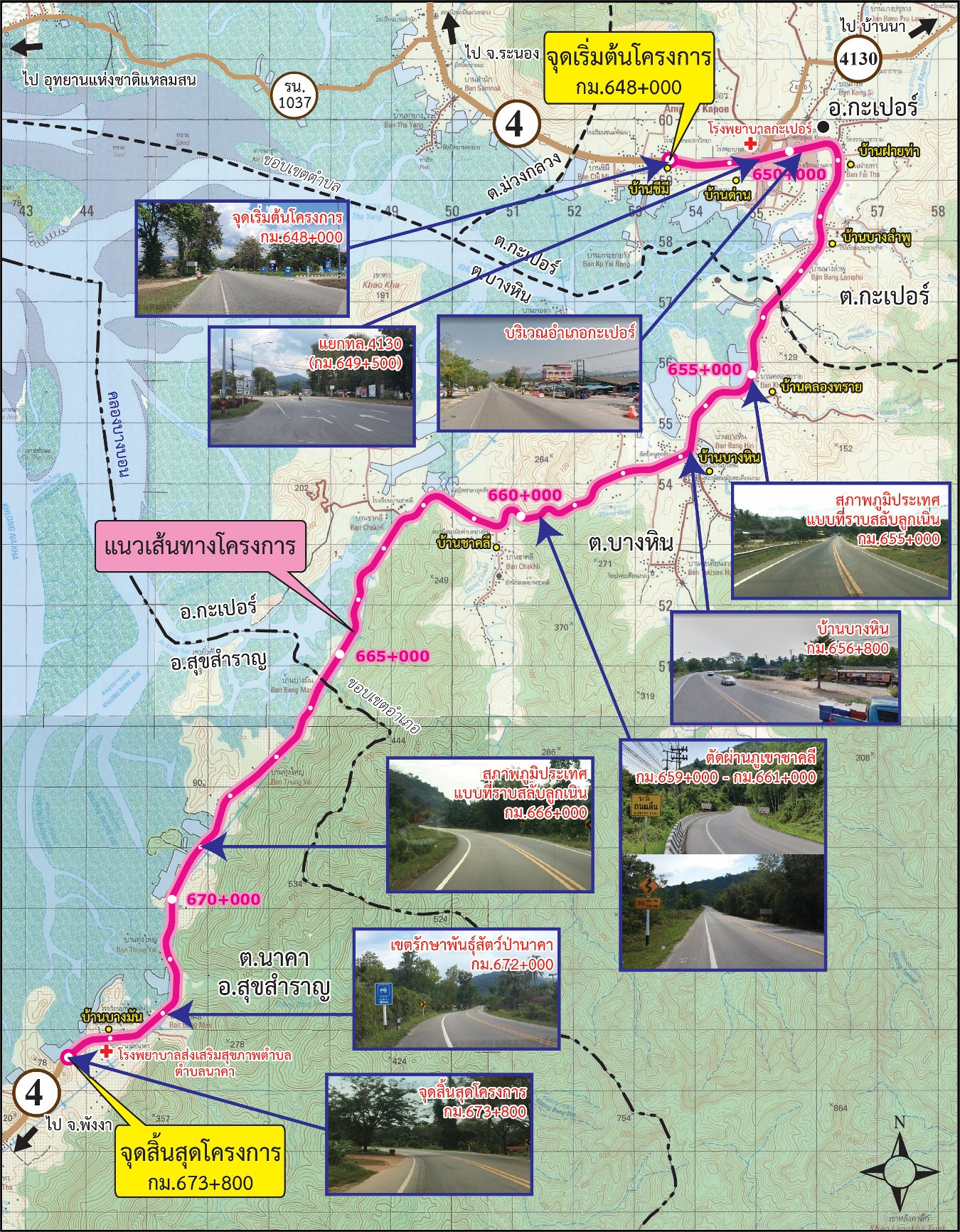 กรมทางหลวง โดยสำนักสำรวจและออกแบบขานรับนโยบายดังกล่าวจึงเร่งดำเนินโครงการสำรวจและออกแบบเพื่อขยายทางหลวงหมายเลข 4 (ถนนเพชรเกษม) ให้มีขนาด 4 ช่องจราจร เนื่องจากสภาพเส้นทางเดิมเป็นทางลาดยางแบบแอสฟัลท์ติกคอนกรีตขนาด 2 ช่องจราจร พื้นที่เป็นที่ราบสลับลูกเนินทำให้การเดินทางและการขนส่งสินค้าไม่ได้รับความสะดวก กรมทางหลวงได้เล็งเห็นความสำคัญจึงดำเนินโครงการดังกล่าว โดยมีจุดเริ่มต้นที่ กม. 648+000 พื้นที่ ต.กะเปอร์ อ.กะเปอร์ จ.ระนอง แนวเส้นทางจะผ่านโรงพยาบาลกะเปอร์ ทางแยกทางหลวงหมายเลข 4130 ไป บ.บ้านนา และตัดผ่านชุมชน บ.ชาคลี และ บ.บางมัน จนกระทั่งสิ้นสุดโครงการที่ กม. 673+800 (บริเวณบ้านบางมัน) อยู่ในพื้นที่ ต.นาคา อ.สุขสำราญ จ.ระนอง โดยใช้วงเงินงบประมาณในการก่อสร้างโครงการ 1,930 ล้านบาท ปัจจุบันอยู่ระหว่างการจัดเตรียมรายงานการประเมินผลกระทบสิ่งแวดล้อม (EIA) เพื่อจัดส่งให้สำนักงานนโยบายและแผนทรัพยากรธรรมชาติและสิ่งแวดล้อมพิจารณาต่อไป คาดว่าเริ่มดำเนินการได้ในปีงบประมาณ 2568 โดยใช้ระยะเวลาก่อสร้างประมาณ 3 ปี มีรายละเอียดงานดังนี้
