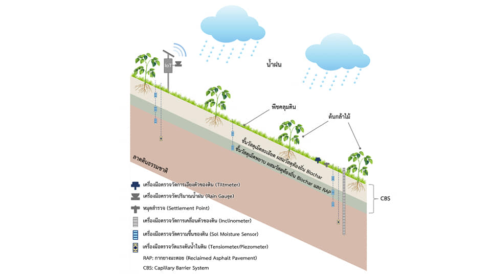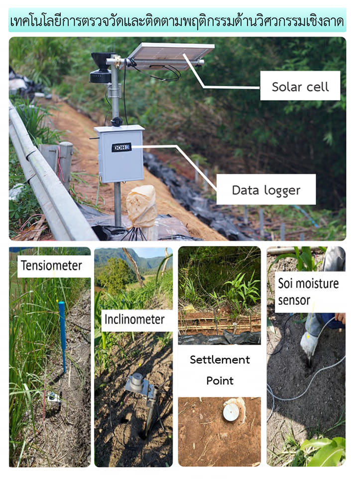 สำหรับการศึกษาโครงการดังกล่าว ได้ดำเนินการในพื้นที่นำร่องไปแล้วทั้งหมด 4 จุด ได้แก่ 1) ทล. 1192 กม.11+500 จ.เชียงใหม่ 2) ทล. 118 กม.46+700 จ.เชียงใหม่ 3) ทล. 21 กม.324+151 จ.เลย และ 4) ทล. 21 กม.329+700 จ.เลย พบว่า มีจุดเด่นที่เป็นประโยชน์หลายด้าน ทั้งการประยุกต์ใช้พรรณพืชตามหลักชีววิศวกรรม (Bio-engineering) การนำวัสดุท้องถิ่น (Local) และวัสดุหมุนเวียน (Recycled) กลับมาใช้ใหม่ การบริหารจัดการน้ำผิวดินและน้ำใต้ดินอย่างเป็นระบบและมีประสิทธิภาพ การสาธิตการทำงานของเทคโนโลยีตรวจวัด ติดตาม รายงาน และประเมินความปลอดภัยทางด้านวิศวกรรมด้วยระบบอุปกรณ์ตรวจวัดในสนามที่เชื่อมต่อกับแพลทฟอร์มอินเทอร์เน็ต (IoT Platform) ซึ่งทำหน้าที่รายงานข้อมูล พยากรณ์ เตือนภัย ประเมินความปลอดภัย ความเสี่ยงต่างๆ และติดตามเฝ้าระวังภัยพิบัติดินสไลด์แบบ Real Time ผ่าน Web Application