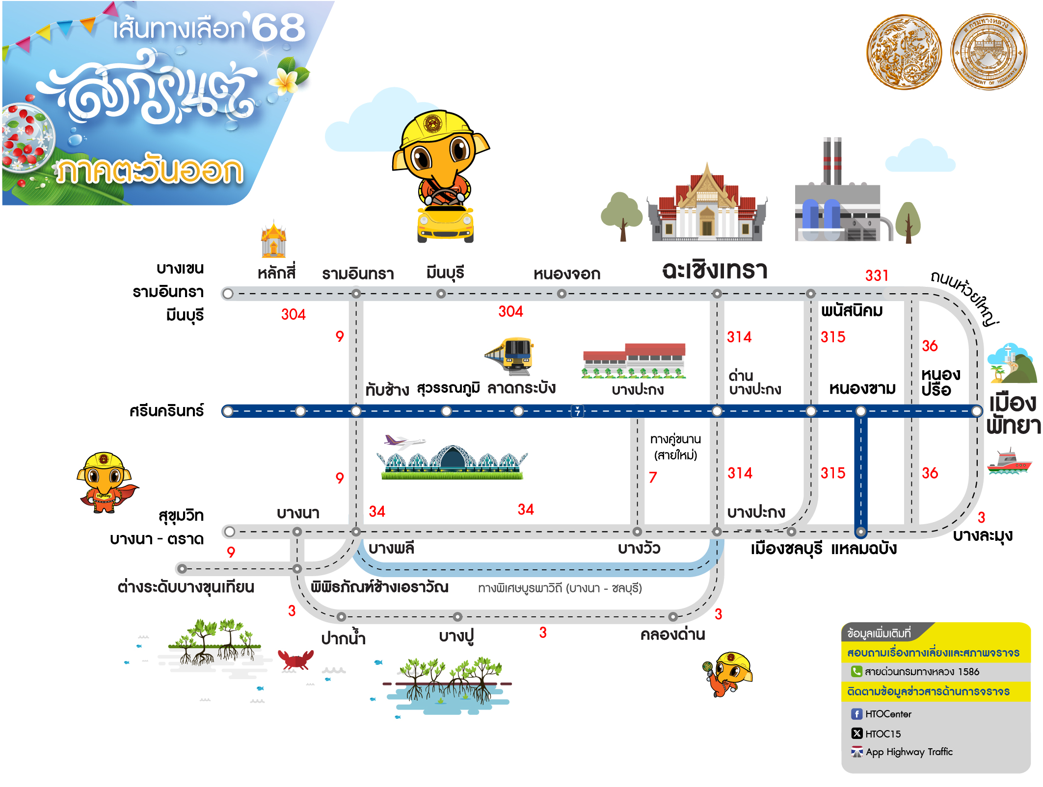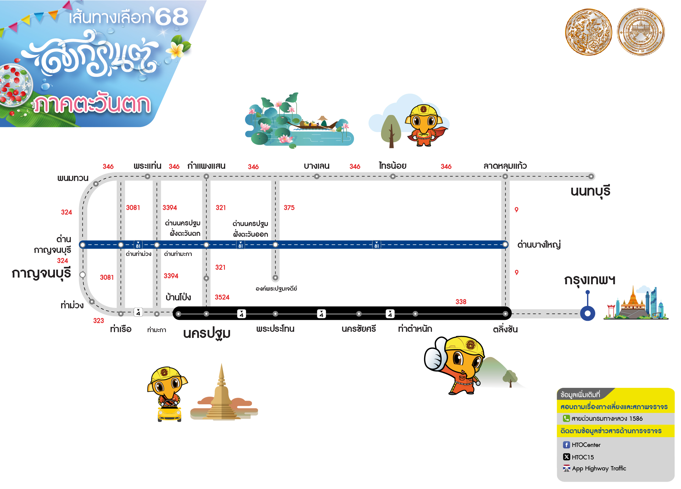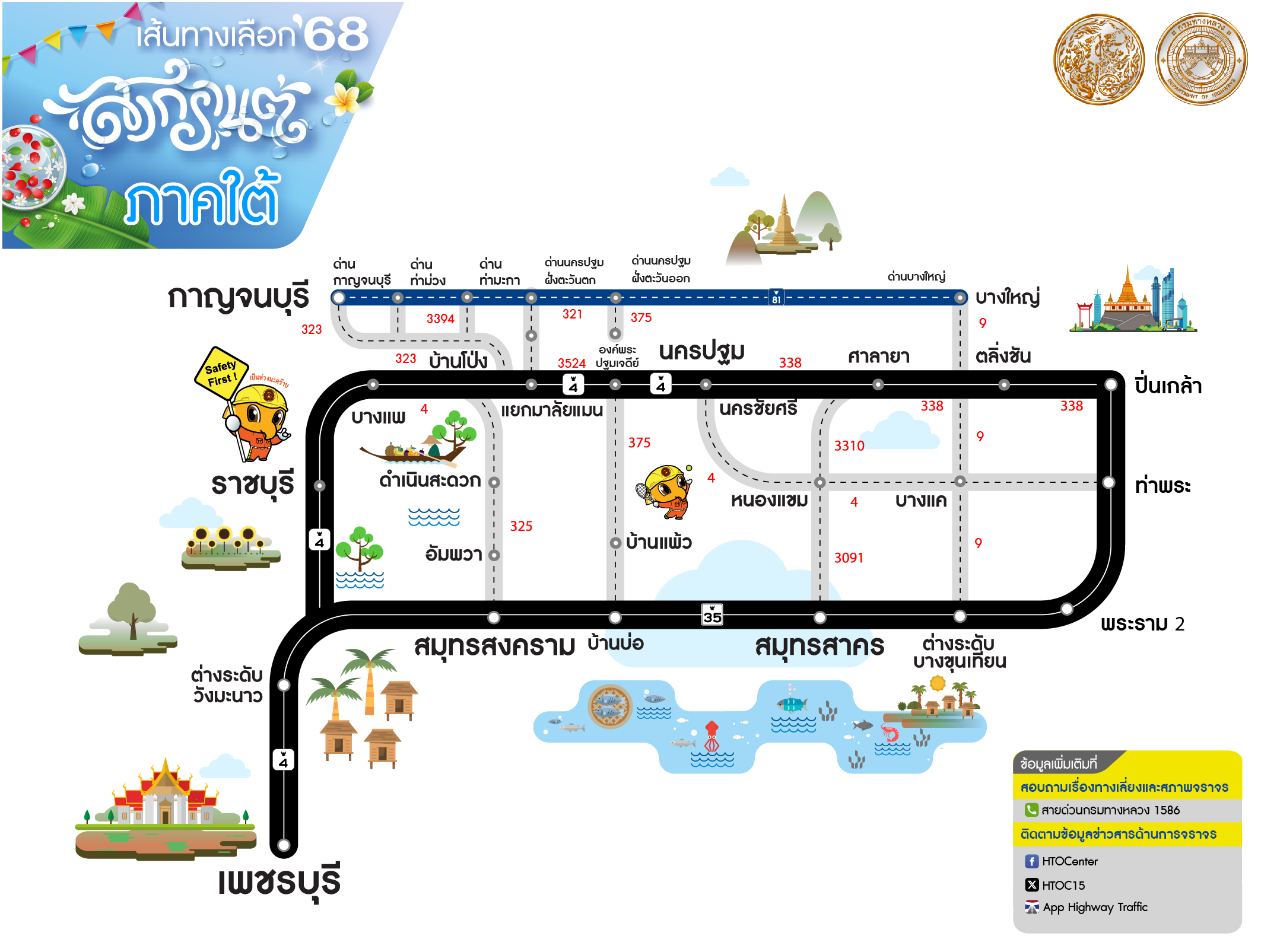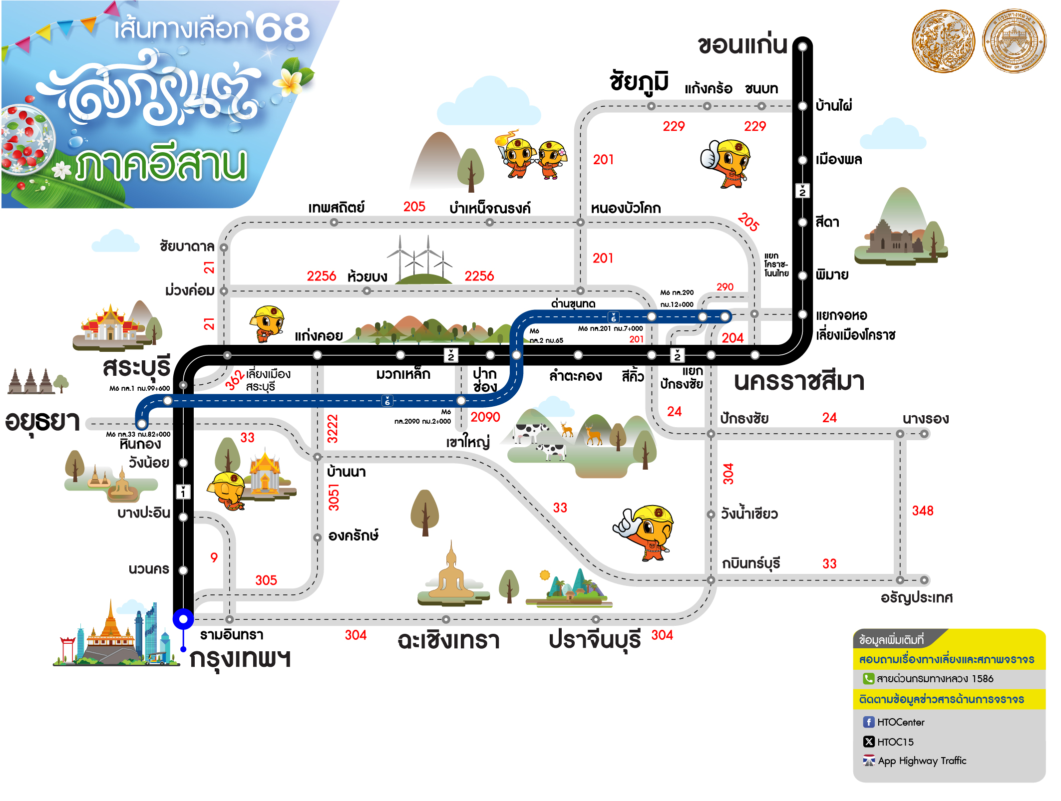 หากประชาชนต้องการสอบถามข้อมูลการเดินทางเพิ่มเติมหรือแจ้งเหตุด่วนเหตุร้ายระหว่างเดินทาง สามารถติดต่อได้ที่สายด่วนกรมทางหลวง 1586 (โทรฟรีทุกเครือข่ายตลอด 24 ชั่วโมง) สายด่วนมอเตอร์เวย์ 1586 กด 7 และตำรวจทางหลวง 1193