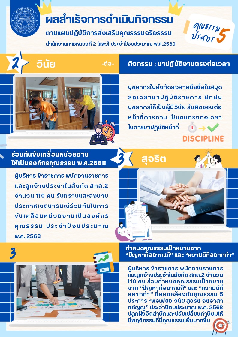 ผลสำเร็จการดำเนินกิจกรรม ตามแผนปฎิบัติการส่งเสริมคุณธรรมจริยธรรม สำนักงานทางหลวงที่ 2 (แพร่) ประจำปีงบประมาณ พ.ศ.2568